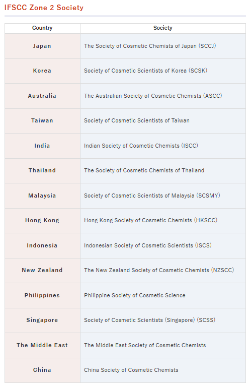 IFSCC Zone 2 (亚洲区域)的成员SCC包括:日本、韩国、澳大利亚、印度、泰国、马来西亚、泰国、印度尼西亚、新西兰、菲律宾、新加坡、中东、中国等。